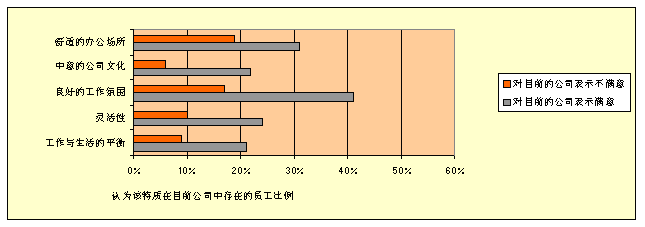 - 对比对目前工作满意的员工和对目前工作不满意的员工对此次问卷调查的答案,不难发现他们所在公司之间存在的一些显著的差异,主要表现在工作与生活的平衡、灵活性(灵活的工作时间、在及办公等)、良好的工作氛围、中意的公司文化以及舒适的办公场所(办公设施、家具等)等方面。